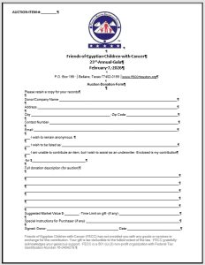 FECC is accepting donations for the upcoming 2026 Gala Fundraiser Silent and Live Auctions. If you would like to donate items to be placed in the auctions, please click on the Auction Donation form below, print and fill out the requested information and contact Dr. Samia Khalil at (713) 833-7073 or email: samiakhalil41238@gmail.com